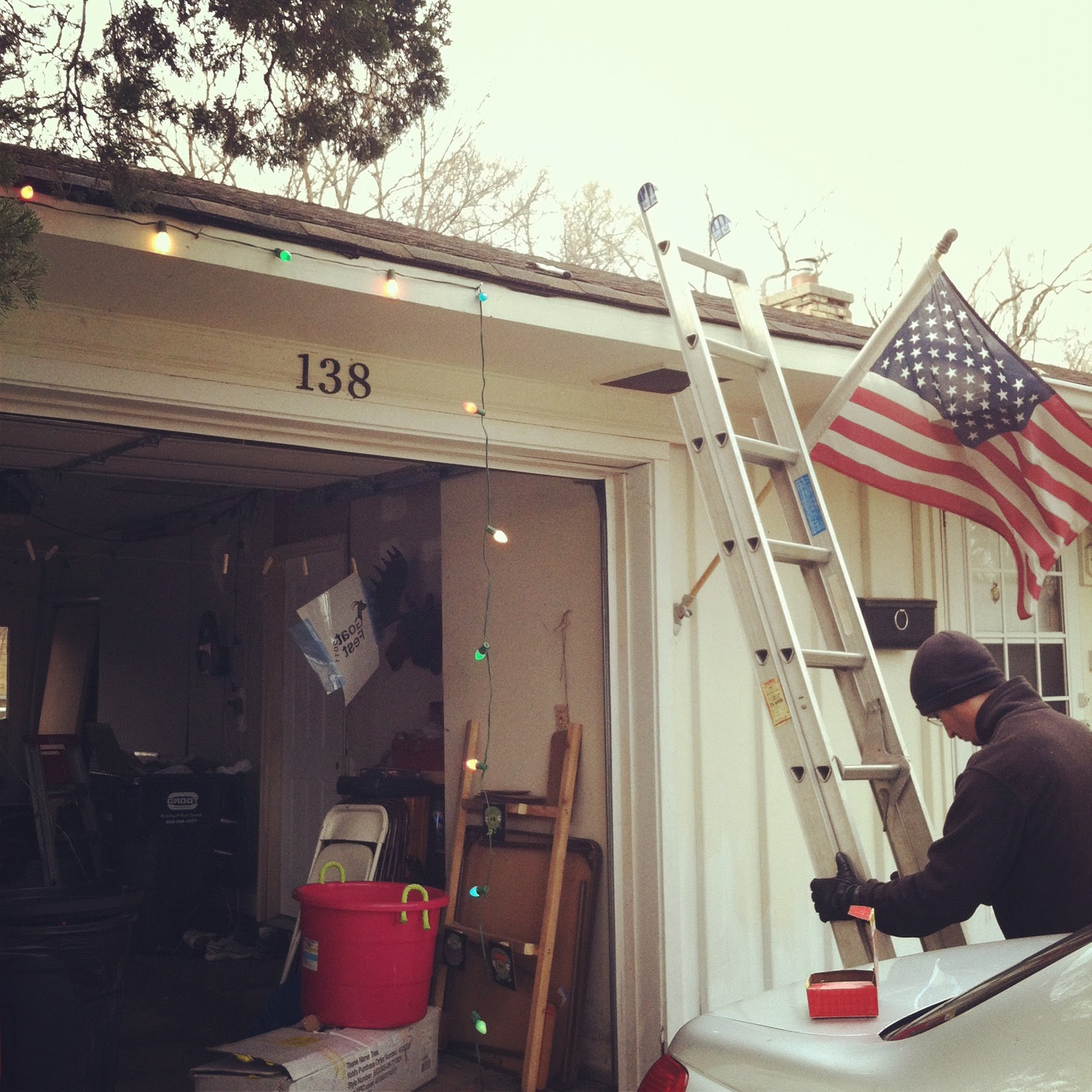 The moose head in all of its glory above the TV. I used to hate this thing, but it is growing on me. It usually resides in the garage, but I have decided to bring it inside for the sake of Christmas. I might like it more because while I was stringing the lights on the antlers I noticed how broken they are and that he might be on his way out the door. Mixed emotions friends, mixed emotions.